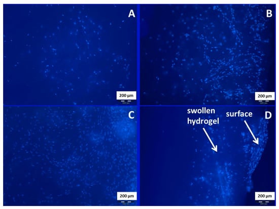 Additionally, the HMSC cells were seeded on the film surfaces, cultivated for 3 days, and stained by DAPI in order to visualize cell attachment (Figure 13A–C) and ingrowth (Figure 13D). A greater amount of attached cells was detected in the case of modified PLA films. In this experiment, no visible difference between PLA-PAAm and PLA-Alg gels was found (Figure 13B,C). However, PLA-Alg gel provided the ingrowth of HMCS cells inside the gel.