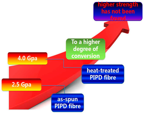 3,3-diaminobenzidine (DAB) was initially used to produce high-strength polybenzimidazole fibers, as reported in U.S. Patent No. 3987015 [17]. In this study, a third comonomer, 3,3-diaminobenzidine, is incorporated into the PIPD molecular structure. Because π bonding is important for modulus and strength, the presence of the two phenyl groups in DAB implies that PIPD-DAB has a more interatomic bond energy, a greater number of transfer and load-holding chains in polymer chains (layers), and an absence of “weak” bond side substituents and branches. The additional incorporation of a third type of links (DAB) in the molecular chains results in partially statistical irregularity. Therefore, PIPD-DAB cannot entirely form a liquid-crystalline order in solutions, nor a 3D crystalline order in the solid state. PIPD-DAB is fundamentally different in comparison with unmodified PIPD, which is liquid-crystalline in solutions and 3D crystalline in a solid state. It follows from the above that the rapid crystallization of regular PIPD may prevent the maximum orienting order due to the decrease in molecular mobility, both in the stage of the fiber structure formation and in thermal treatment. The partial liquid–crystalline order in the solutions during fiber formation caused more approaches in the direction of most bonds to the direction of the chain axis, a less effective chain cross section, and more degrees of polymerization and of supramolecular ordering (crystallinity, orientation). Figure 1 shows the PIPD fiber tensile strength. Up to now, prepared PIPD fiber moduli have been 150–360 GPa, and tensile strengths have been 2.5–4.0 GPa [6,18,19,20,21]. To the best of our knowledge, no experimental study has been conducted in order to improve the tensile strength and heat resistance of PIPD fibers using the incorporation of a third comonomer.