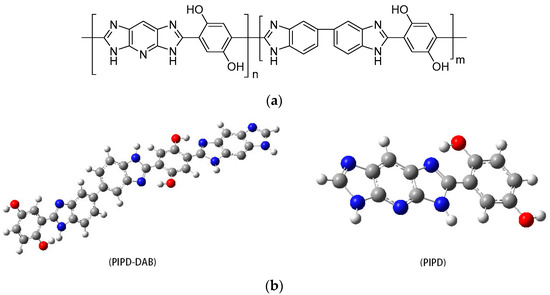 (a) Chemical structure of modified polybenzimidazole poly PIPD-3,3-diaminobenzidine (DAB); (b) structural formula of polybenzimidazole poly PIPD and PIPD-DAB (gray: C, blue: N, red: O, white: H).