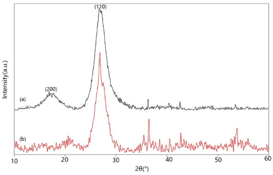WAXD patterns from equatorial scans of PIPD and PIPD-DAB fibers are shown in Figure 6. In Figure 6a, two diffraction peaks at (200) and (110) can be observed due to PIPD being used as the liquid crystal polymer. As revealed in Figure 6b, the (110) peaks can be observed; the (200) peaks gradually disappeared. This may have been caused by the transition of states, from a liquid crystalline state to a non-liquid crystalline state. In addition, the polymer chain orientation of PIPD and PIPD-DAB could be computed using Herman’s orientation factor (Equation (1)) [28]. Herman’s orientation factor equation can be simplified as Equation (2).