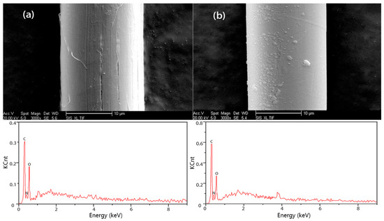 As shown in Figure 8, the compositions of PIPD and PIPD-DAB are characterized using Energy Dispersive X-ray Spectroscopy (EDX) and SEM images. Figure 8 demonstrates the morphology of the longitudinal outer surfaces of PIPD and PIPD-DAB fibers. It is well known that PIPD fibers consist of fibril bundles of 20 μm and fibrils of a smaller size. This fiber structure can be partially seen in Figure 8a. There are slight cracks and micro-fibrils on the fiber surfaces, which may be caused by the friction between the fiber spinneret and fiber scoops in the spinning process [29]. The surface texture also reflects the uniformity of the coagulation process, and subsequent fiber shrinkage is due to the volume loss of the solvent PPA. It is evident from Figure 8a,b that the outer surface of the PIPD-DAB fiber is smoother than that of the PIPD fiber. The reason for this may be associated to the incorporation of DAB into the PIPD chains, which can enhance the tenacity of the fiber upon a beneficial improvement in the mechanical properties of the fibers.