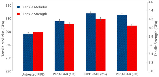 Figure 9 demonstrates that the mechanical properties of PIPD and PIPD-DAB polymer fibers. PIPD fibers present an average tensile strength of 3.9 GPa, and an average tensile modulus of 287 GPa. The heat-treated fiber tensile strength and modulus, compared to unmodified PIPD fibers after the addition of 1% DAB, increased by 4.8% and 6.7%, respectively, while those of PIPD-DAB (2%) are 7.7% and 10.8% higher than the values for the PIPD fibers, respectively. However, the mechanical characteristics and tensile strength, tensile modulus, and strain to failure of PIPD-DAB (3%) fibers decreased by 3.9% and 10.0%, respectively. The enhanced mechanical properties should be attributed to DAB, which is indicative of the fact that the rapid crystallization of regular PIPD may prevent reaching the maximum orienting order due to the decrease in molecular mobility, in the fiber structure formation stage (by spinning) and in thermal treatment. When the concentration of PIPD-DAB reached 1% and 2%, the solution presented a non-liquid-crystalline (isotropic) state and then a change in transition to the liquid-crystalline state occurs during the process of fiber structure formation, which contributes to an improvement in mechanical properties. However, the excess addition of PIPD-DAB, e.g., a content of 3% may make the transition state, as mentioned above, a non-liquid-crystalline (isotropic) state, which consequently contributes to a decline in tensile strength and modulus.
