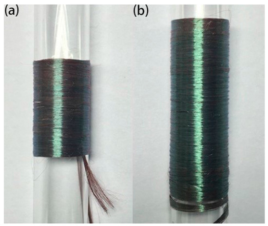 Photograph of (a) PIPD and (b) PIPD-DAB (2%) fibers collected using spools.