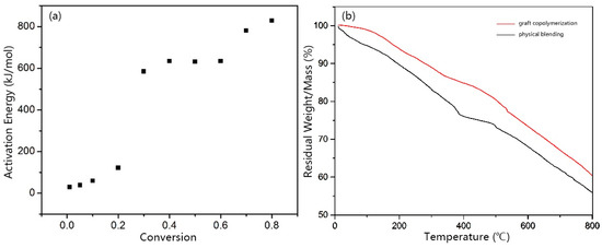 (a) The activation energies of PIPD-DAB at different conversions; (b) The curves of graft copolymerization and physical blending composite fibers.