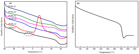 The miscibility of the blending components in an amorphous state can be assessed based on glass transition behavior of blends, provided that the difference in Tgs of the two components is more than 20 °C [22]. A fully miscible polymer blend exhibits only one Tg, whereas completely immiscible blends usually have two independent Tgs close to those of the individual component. If the Tgs of components shift to each other after blending, the two components are partially miscible. Figure 2 shows the DSC heating curves for melt-quenched samples. As can be seen from the DSC curve for PVPh-0, the Tgs for PBSA and PLLA in blends were around −37.7 °C at 51.6 °C, respectively, which are close to those of neat components [19,20,23]. This suggests that PBSA and PLLA are completely immiscible in the absence of PVPh, which is in accordance with that reported in literature [10]. PVPh is an amorphous polymer with high glass transition temperature of about 183 °C as shown in Figure 2b. The Tgs for PBSA increased with PVPh addition, while the Tgs for PLLA remained almost constant. The approaching Tgs indicate that the miscibility of PBSA and PLLA were improved. When 50 wt % of PVPh was incorporated into a PBSA/PLLA blend, only one single Tg around 45.0 °C could be observed, implying that PBSA and PLLA are miscible in an amorphous state. The Tg1 for PBSA and Tg2 for PLLA are listed in Table 2.