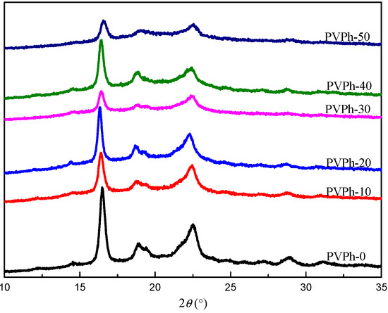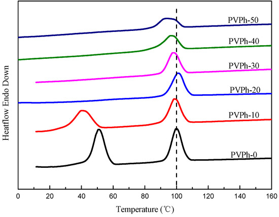 It is also interesting to note that a weak exothermic peak around −6.0 °C and a much stronger one at 18.0 °C were present on DSC curves for PVPh-0 and PVPh-10, respectively, which could be attributed to cold crystallization of PBSA component in blends. However, no discernible peaks were observed at corresponding locations for samples with higher PVPh content. These can be explained that the introduction of PVPh retarded crystallization of PBSA. The crystallization rate of PBSA is too fast in PVPh-0, so it crystallized to a relatively high crystallinity degree during the rapid cooling process. Remaining crystallizable segments completed crystallization following the heating process at a rate of 10 °C/min, which formed a weak exothermic peak on the DSC curve. For PBSA in PVPh-10, the crystallization was somewhat impeded due to intermolecular hydrogen bonding formation and did not crystallize or crystallized very little after rapid cooling, resulting in a highly amorphous state. Cold crystallization occurred during following heating process and formed a stronger exothermic peak in a higher temperature range than those of PBSA in PVPh-0. With further PVPh addition, the crystallization of PBSA in blend samples was largely hindered and did not crystallize in rapid cooling and subsequent heating process.