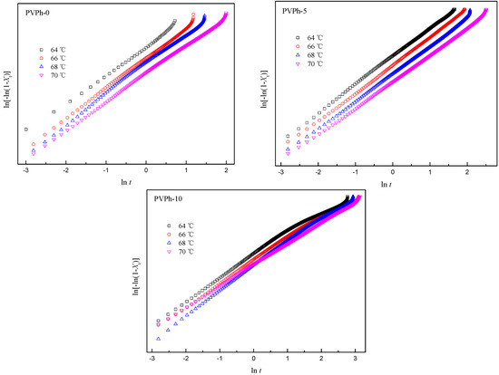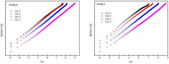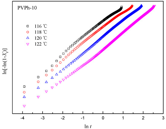 where Xt is the relative crystallinity degree at time t, k is the crystallization rate constant and n is the Avrami exponent dependent on crystallization mechanism and crystal growth dimensions. Using the double logarithmic form of Equation (1), one can obtain k and n values from slopes and intercepts of plots of ln[−ln(1 − Xt)] versus lnt, respectively. The Avrami plots for isothermal crystallization of PBSA in blend samples at designated temperatures are presented in Figure 5. As can be seen, the plots of ln[−ln(1 − Xt)] against lnt generally show good linear correlation, which means that the Avrami theory was applicable in the isothermal crystallization of PBSA in PBSA/PVPh/PLLA blends. However, it is also noticeable that deviations from Avrami plots occur in the later stages of crystallization, which is ascribed to spherulite impingement [20,25]. The Avrami parameters were obtained using the linear portion of plots of ln[−ln(1 − Xt)] versus lnt and are listed in Table 3. Avrami exponent n values listed in Table 3 were decimals between 2.3–2.7, indicating that crystalline branching and/or two stage crystal growth might present in the crystallization process, and the PBSA spherulites assumed a two-dimensional to three-dimensional growth with a combination of homogeneous and heterogeneous nucleation [20].