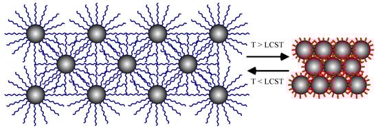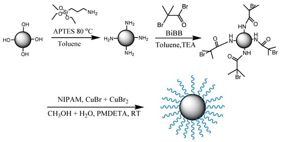 - Wu, T.; Zhang, Y.; Wang, X.; Liu, S. Fabrication of hybrid silica nanoparticles densely grafted with thermoresponsive poly(N-isopropylacrylamide) brushes of controlled thickness via surface-initiated atom transfer radical polymerization. Chem. Mater. 2008, 20, 101–109. [Google Scholar] [CrossRef]