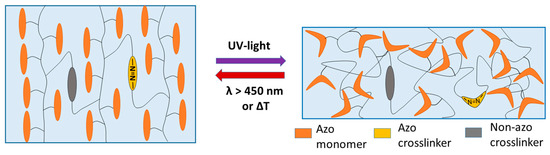 Recently, we prepared an azo-LCE system, which showed a fast and strong photoactuation (length change) of up to 34%, when illuminated with a white light-emitting diode (LED) lamp at 440 nm [49]. This is remarkable as, firstly, most azo-containing LC networks are densely crosslinked, which limits their length change. Secondly, and more importantly, usually bending movements are reported. These bending movements are—besides some carefully designed experiments to promote bending by the director pattern—mostly the result of a strong variation of the light intensity inside the LC network, due to the high optical density of the azo system in the UV region. Thus, concepts to increase the optical penetration depths in weakly crosslinked systems are required in order to obtain “thick” LCEs with large optically induced length changes without bending. In addition to these considerations, it is desirable to induce photo-addressable crosslinking points (Figure 1) because they allow a variation of the crosslinker density without strongly changing the optical properties of the LCEs. In addition, former studies claim that, by using azo-benzenes as the crosslinker, a higher mechanical response of LCE films can be achieved than by just having the azo moiety incorporated in the mesogenic side groups [50,51]. A scheme of such LCE systems is drawn in Figure 1.