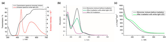 (a) The crosslinker’s transmission spectrum compared to the emission spectrum of the white light light-emitting diode (LED) which was used for the irradiation; (b) UV–vis spectrum of the monomer mixture before and after irradiation with UV light as well as after irradiation with the white light LED; (c) molar extinction coefficient spectrum of the monomer mixture before and after irradiation with the white light LED. All absorption/transmission spectra were measured at room temperature (RT) in dichloromethane (DCM).