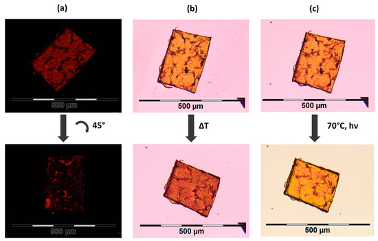 Figure 4 shows one of the produced films (10 mol % crosslinker, thickness: 50 µm, polymerized at 60 °C) under the polarized light microscope. According to Figure 4a, the mesogens are well oriented since the birefringence disappears by rotating the film by 45°. In Figure 4b, the thermal actuation can be seen. By heating the film from room temperature to above the nematic-isotropic phase transition temperature (TNI), it becomes much shorter, simultaneously widening and thickening. TNI was found to be about 92 °C according to the POM measurements. A slightly weaker actuation (photoactuation) is observable when the sample is irradiated with white light of a cold light source at temperatures close to TNI (Figure 4c and Video S1 in Supplementary Materials).