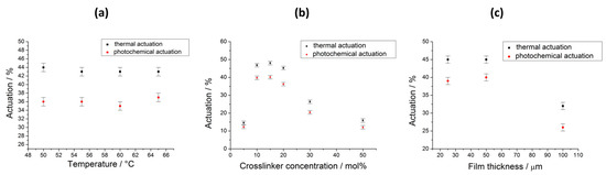 First, the influence of the polymerization temperature on the actuation properties was investigated based on a film with 20 mol % crosslinker concentration and a thickness of 50 µm. A deformation of the film was just observable for temperatures between 50 and 65 °C—the temperature range of the liquid crystalline phase—because below this temperature the mixture started to crystallize and above TNI the orientation of the sample was lost. However, the polymerization temperature did not have a big influence on the actuation properties in this range, as can be seen in Figure 5a. For all temperatures, the thermal actuation is about 44% and the photoactuation amounts to about 36%. This can be explained by the fact that the magnetic field orients the director field (makes it more or less uniform), but it does not modify the order parameter in the LC domains. On the other side, the director field is still free to change with temperature in the LCEs, which is the basis for their deformation. In this respect, samples prepared at different crosslinking temperatures, but with about an equally oriented director field, can be assumed to behave similarly.
