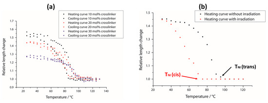 Thermoresponsive behavior of this LCE system. (a) Heating and cooling curves for three films with different crosslinker concentrations, respectively; (b) heating curve for an LCE film with and without irradiation. Here, TNI (trans) is the phase transition temperature of the film’s all-trans state and TNI (cis) the one for its photostationary state under irradiation.