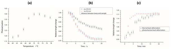 Photoresponsive behavior of this LCE system. (a) The photoactuation of an LCE film for different temperatures during the irradiation; (b) time dependence of the photoactuation for two different light intensities (distances between lamp and sample); (c) time dependence of the back-deformation of the sample, induced either by red light or by keeping the film in the dark (isothermal back-deformation).