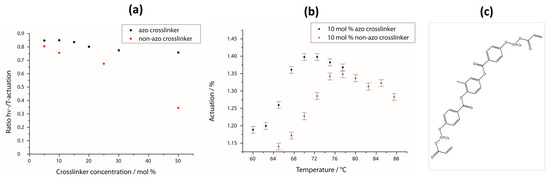 Comparison of the azo crosslinker with a similar non-azo crosslinker. (a) Ratio between photo- and thermal-actuation as a function of the crosslinker concentration, respectively; (b) comparison of the temperature dependence of both systems’ photoactuation; (c) chemical structure of the non-azo crosslinker.