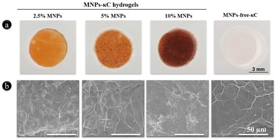 The analysis of the surface morphology of freeze-dried MNPs-κC hydrogels at a microscopic level demonstrated that the increasing concentration of MNPs within the matrix did not seem to significantly impact the scaffold morphology in comparison with the MNP-free-κC hydrogels.