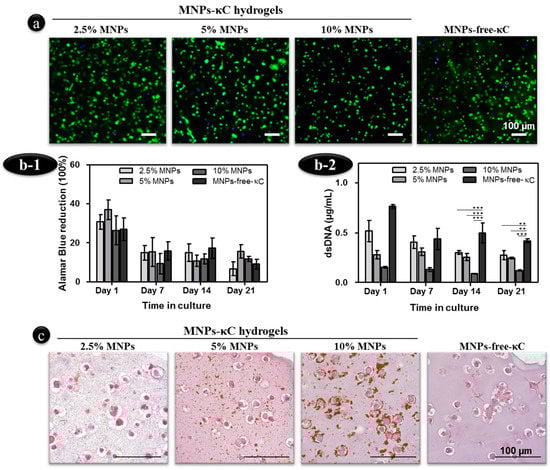 Influence of the MNPs concentration on the behavior of hASCs encapsulated in MNPs-κC hydrogels. (a) Live/dead assay of hASCs laden in MNPs-κC hydrogels cultured for 21 days. Cell nuclei were counterstained with DAPI (blue). Scale bar: 100 μm and original magnification of 5×; (b-1) Alamar Blue quantification did not reveal changes in the metabolic activity of hASCs cultured in MNPs- and MNPs-free-κC hydrogels but (b-2) dsDNA quantification of hASCs indicated statistically significant differences between MNPs- and MNPs-free-κC hydrogels at Day 14 and Day 21 (** p < 0.01; *** p < 0.001); (c) Light microscopy images of paraffin-embedded histological sections of MNPs- and MNPs-free-κC hydrogels with encapsulated hASCs stained with H&E and cultured in basal conditions for 21 days. Scale bar: 100 μm and original magnification of 20×.