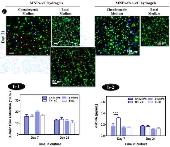 Although the DNA content of hASCs in MNPs-κC hydrogels was lower in chondrogenic cultures at the early time point, namely Day 7 (*** p < 0.001), in comparison to MNPs-free hydrogels, these registered differences were not significant (p > 0.05) after longer periods in culture (21 days) (Figure 3(b-2)).