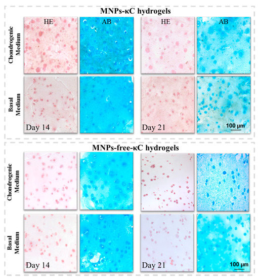 H&E and AB staining of hASCs laden in MNPs-κC hydrogels under magnetic stimulation are represented in Figure 4. hASCs in H&E sections exhibited the typical chondrogenic-like round morphology in both MNPs- and MNPs-free-κC hydrogels independently of the culture medium. Furthermore, cells were homogenously distributed within the hydrogel matrix with an apparent increased cellular density in chondrogenic cultures.