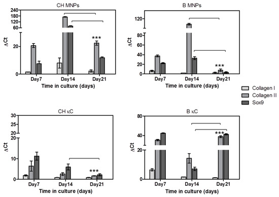 Relative expression of chondrogenic-specific transcripts, namely Collagen type I, Collagen type II and Sox9 of hASCs cultured on MNPs-κC-hydrogels for 7, 14 and 21 days under the actuation of an external magnetic field. The expression of these genes was normalized against the housekeeping gene GAPDH and calculated by the ΔCT method. Data was analyzed by two-way ANOVA, followed by Bonferroni post-tests. Horizontal bracket lines denote statistically significant differences (p < 0.05) when comparing Day 14 with Day 21 time points and *** corresponds to a significant statistical difference (p < 0.001) for Day 21 in different conditions. MNPs- and MNPs-free-κC-hydrogels (experimental controls) cultured in chondrogenic medium are designated as CH MNPs and CH κC, respectively, while MNPs and MNPs-free-κC-hydrogels cultured in basal medium are labeled as B MNPs and B κC, respectively.
