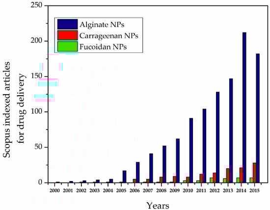 Polysaccharide-based NPs can be obtained using different types of methods. In particular, the most widely studied methods are ionic linking, covalent cross-linking, self-assembly, and polyelectrolyte systems. Research on polysaccharide-based NPs (e.g., alginate, carrageenan, and fucoidan) for DDS has been increasing dramatically over the last decade (Figure 1) [21,40]. Polysaccharide-based NPs have advantages due to abundant availability and biocompatible properties, which make them important candidates for drug delivery system [41,42,43,44]. Posocco et al. (2015) [45] suggested that polysaccharide-based materials exhibit the following advantages: