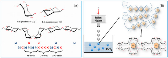 (A) The structure of alginate; (B) The formulation of egg box-shaped NPs by an ionic gelation method. The figures were adopted with permission from [60].