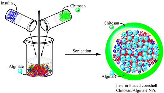 A schematic showing the preparation of chitosan-alginate NPs incorporating insulin. This figure was adopted and redrawn from [77]. Copyright 2015, Elsevier.