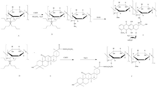 The synthesis route of doxorubicin-modified alginate (DOX–ALG) (top) and glycyrrhetinic acid-modified alginate (GA–ALG) (bottom). The figures were adopted and redrawn from [91].