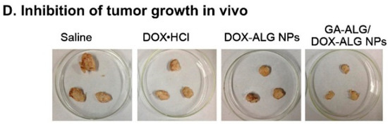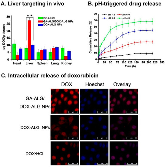 (A) The results of an in vivo liver targeting study; (B) the release results at different pH levels; and (C) the cellular uptake of doxorubicin using glycyrrhetinic acid–alginate (GA–ALG)/doxorubicin–alginate (DOX–ALG) NP complexes and doxorubicin–alginate (DOX–ALG) NPs; (D) H22 tumor tissue slices from mice treated with saline, doxorubicin, doxorubicin-alginate (DOX–ALG) NPs, and glycyrrhetinic acid-alginate (GA–ALG)/doxorubicin-alginate (DOX–ALG) NP complexes. The figures were adopted and redrawn with permission from [91]. Copyright 2013, Elsevier.