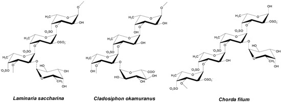 Seaweed can be classified as red, green, or blue. The cell walls of seaweed are often composed of polysaccharides. For approximately four decades, research has been conducted on the structures and applications of seaweed polysaccharides, especially on their functional food applications [46]. Polysaccharides including agar, alginate, fucoidan, carrageenan, and laminarin have been isolated from seaweed [6,25,47].