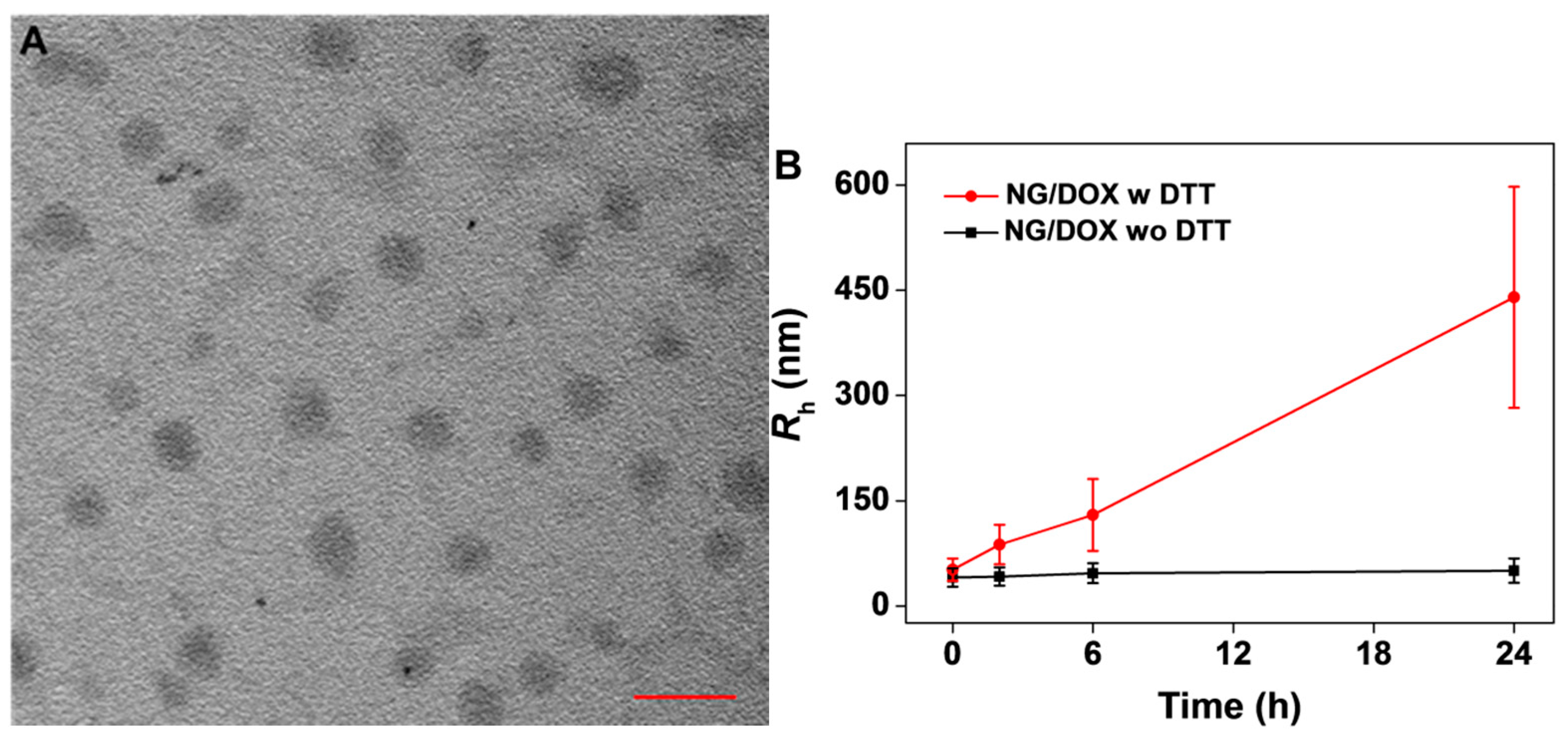 Typical TEM micrograph of NG/DOX dispersed in PBS at pH 7.4 (A). Scale bar meant 200 nm. DLS data changes of Rh (B) and distribution (C) of NG/DOX versus time in 24 h with or without 10.0 mM DTT. “w” represented “with”, and “wo” meant “without”.