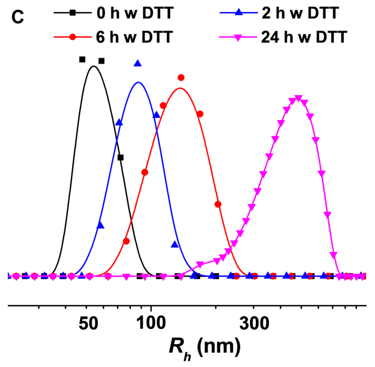 As shown in Figure 2A, the TEM micrograph showed that NG/DOX exhibited a spherical morphology, and the visual diameters were 98 ± 5 nm. Meanwhile, the hydrodynamic radius (Rh) of NG/DOX measured by DLS was 52 ± 16 nm (polydispersity index (PDI) = 0.31; Figure 2B). The difference between the TEM and DLS results should be attributed to the dehydration of loading nanogel in the preparation process of TEM specimen. In addition, as shown in Figure 2B, the size change of NG/DOX dispersed in PBS with 10.0 mM DTT was monitored by DLS. DTT is a kind of strong electronating agent, which could diffuse into the core of nanogel and break the disulfide bond (−S−S−) into two mercapto groups (−SH) [28]. As show in Figure 2B, the Rhs of swollen nanogel in DTT-containing PBS at 0, 2, 6, and 24 h were detected to be 52 ± 16 nm (PDI = 0.3), 88 ± 28 nm (PDI = 0.32), 130 ± 51 nm (PDI = 0.39), and 440 ± 158 nm (PDI = 0.36), respectively. Next, as depicted in Figure 2C, the Rh distribution of nanogel in different periods elevated as the extension of time. In summary, the size increase of NG/DOX under the stimulation of DTT indirectly confirmed the reduction-response characteristic of NG/DOX in vitro.