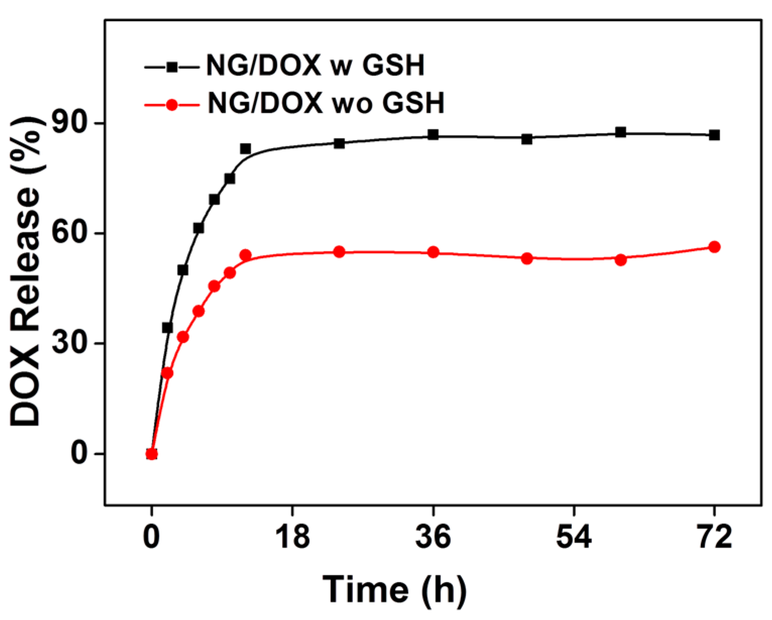 Release behavior of NG/DOX in PBS with or without 10.0 mM GSH at pH 7.4, 37 °C.