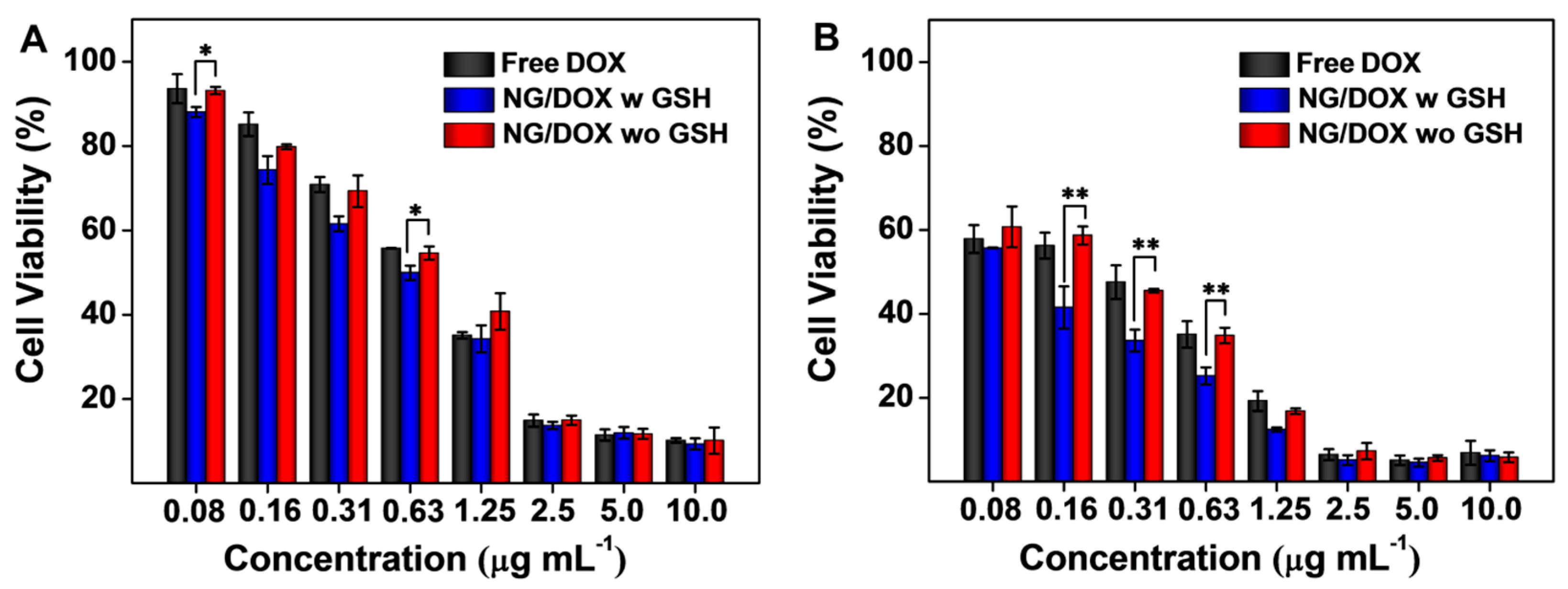 In vitro viability of RM-1 cells with or without 10.0 mM GSH pretreatment after co-incubation with free DOX and NG/DOX for 24 (A) and 48 h (B). Each set of data was represented as mean ± SD (n = 3; * p < 0.05, ** p < 0.01).