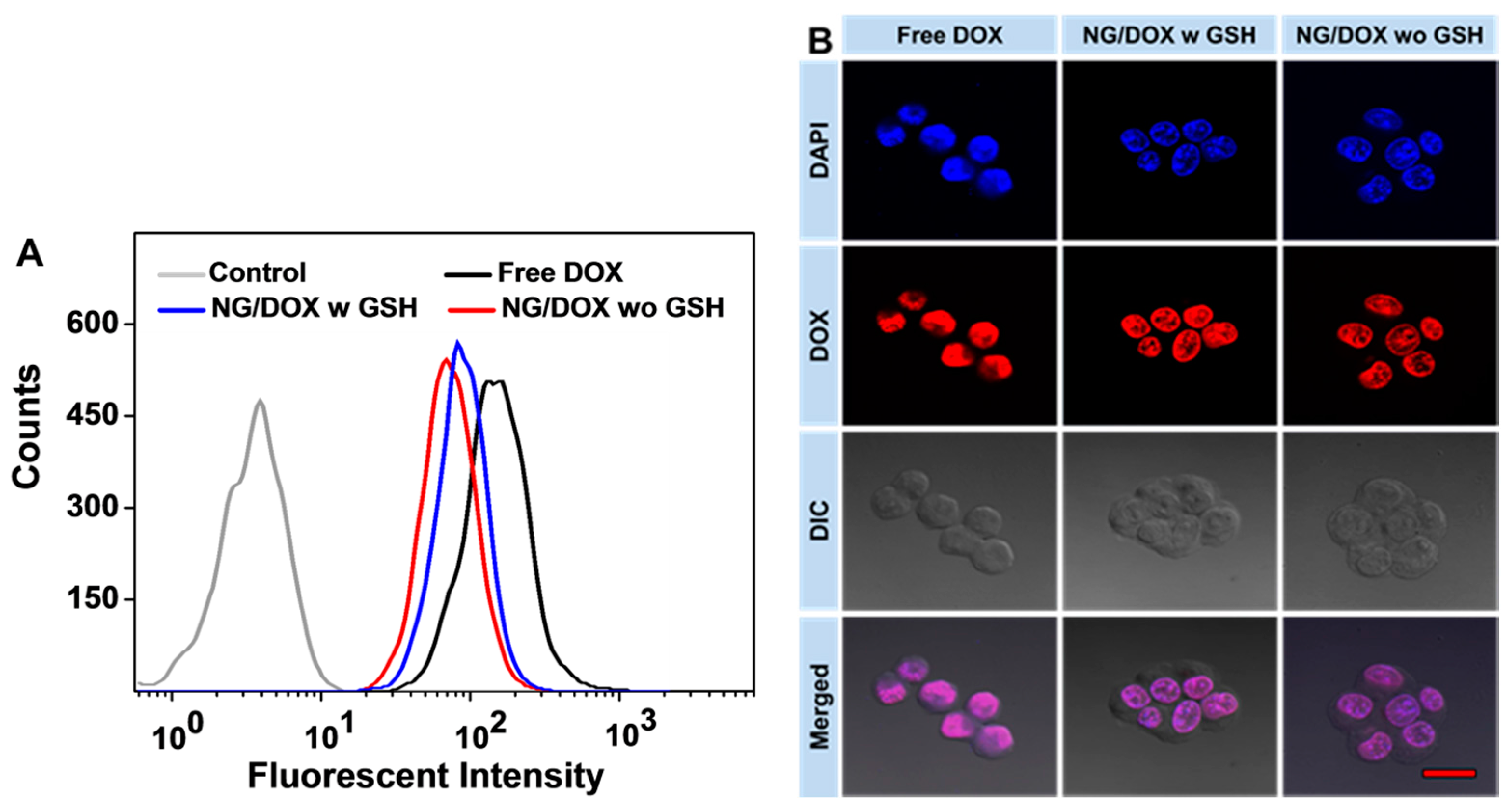 Typical FCM (A) and CLSM determinations (B) of toward RM-1 cells with or without 10.0 mM GSH pretreatment co-incubated with free DOX and NG/DOX for 2 h. Scale bar meant 20.0 μm.