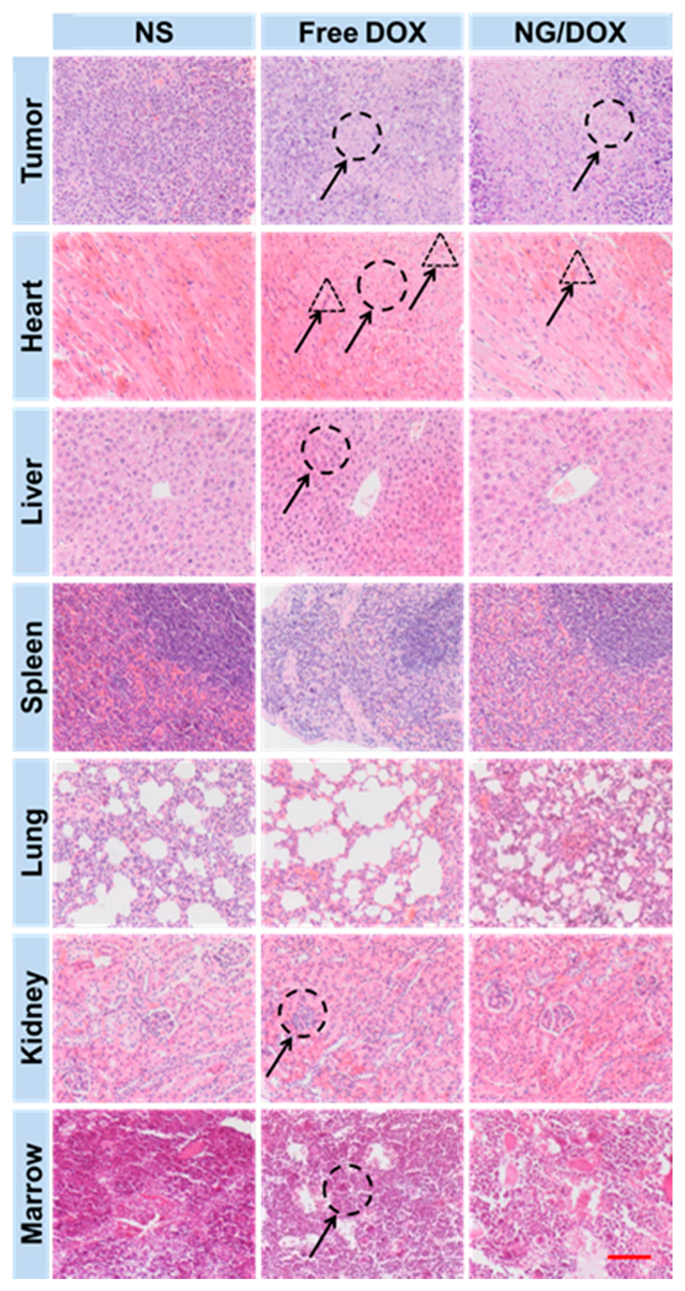 Histopathological analyses of tumors and visceral organ and tissue sections (i.e., tumor, heart, liver, spleen, lung, kidney, and marrow) from RM-1 PCa-grafted mice after all treatments with NS, free DOX, and NG/DOX. The circles pointed out (i) the necrotic areas in tumors; (ii) the changes in cardiac muscle fibers; (iii) the pyknosis and shrinking of hepatocytes; (iv) the shrinking and abnormal glomeruli of kidneys; and (v) bone marrow cell micronuclei. The triangles point out the inflammatory cell infiltration in cardiac tissues in the free DOX and NG/DOX groups. Scale bar meant 200.0 μm.