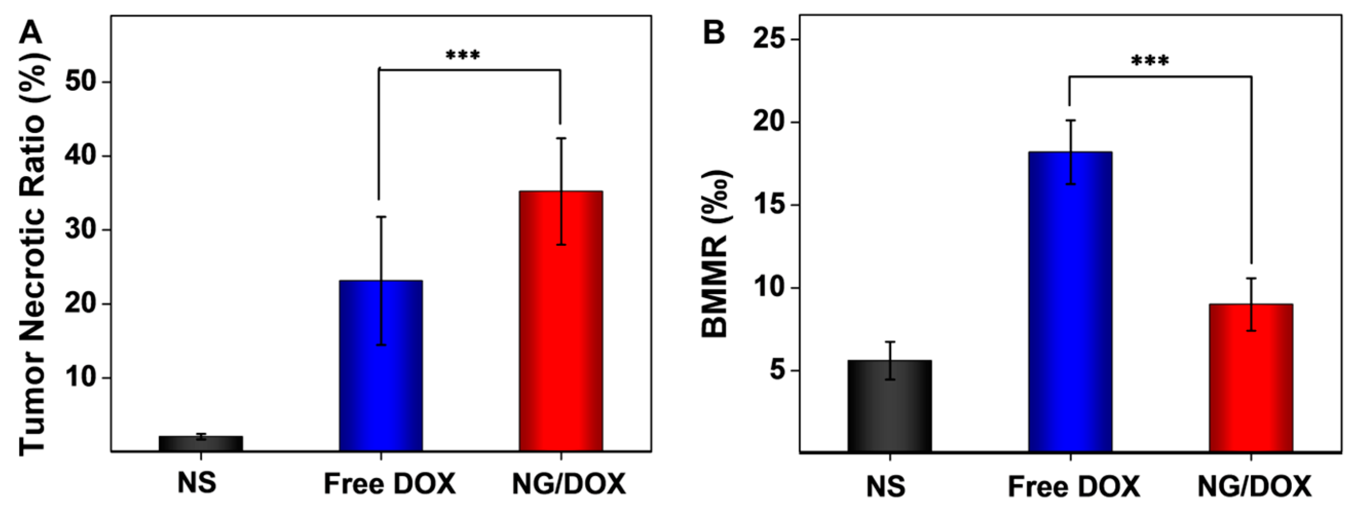 It was obvious that the tumor cells had clear spherical shapes and different nucleus sizes in the NS group (Figure 7). However, large numbers of karyorrhexis and karyolysis nuclei, and extensive areas of tumor necrosis were observed in both the free DOX and NG/DOX groups. In particular, the necrotic area in the NG/DOX group was larger than that in the free DOX group. Furthermore, the semiquantitative analyses of necrotic area in tumors were performed from the H & E results and showed in Figure 8A. As exhibited, the NG/DOX group showed the maximum tumor necrotic area (35.2%) than the NS (2.1%) and free DOX groups (23.15%). The results confirmed a better tumor inhibitory effect from NG/DOX than that of free DOX, and showed great potential of the reduction-responsive nanogel for clinical use.