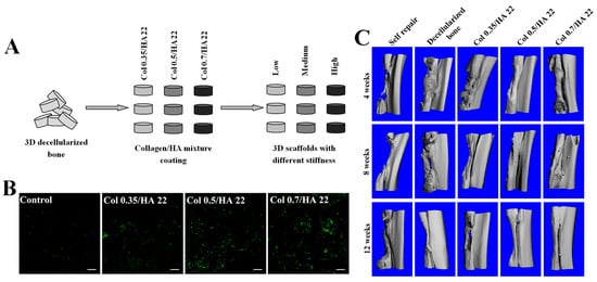 Fabrication of collagen/hydroxyapatite (HA) scaffolds and their application of bone repair. (A) Schematic diagram of the fabrication process of 3D scaffolds with different stiffness. Reprinted from [106]. Copyright 2015 with permission from American Chemical Society. (B) immunofluorescence staining of collagen type I on the scaffolds; scale bar: 200 μm. Reprinted from [106]. Copyright 2015 with permission from American Chemical Society. (C) μ-CT images of segmental radius at 4, 8 and 12 weeks [107]. Copyright 2015 with permission from Wiley.