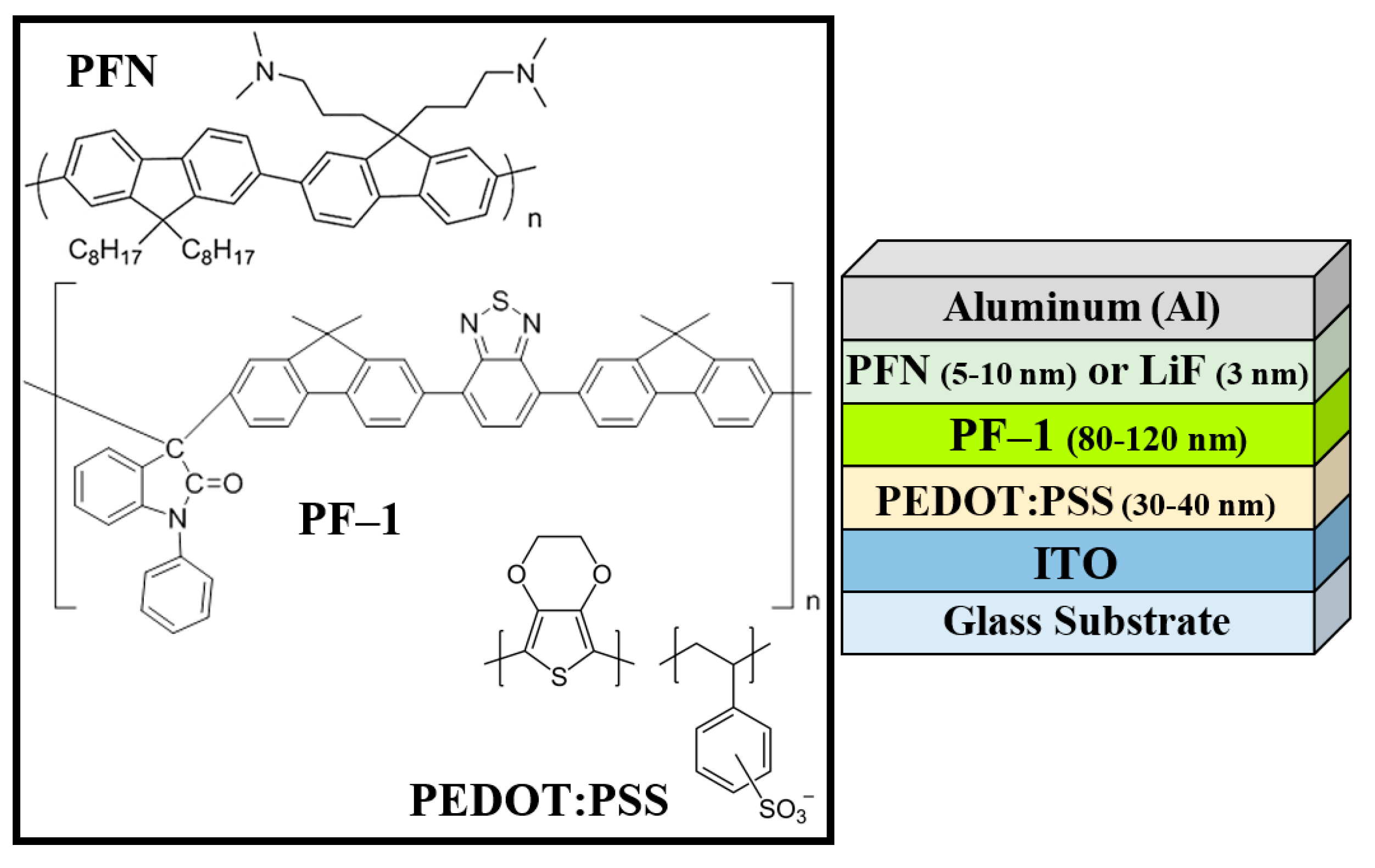 Chemical structure of PFN, conjugated polymer PF–1, and PEDOT:PSS; and PLEDs architecture.