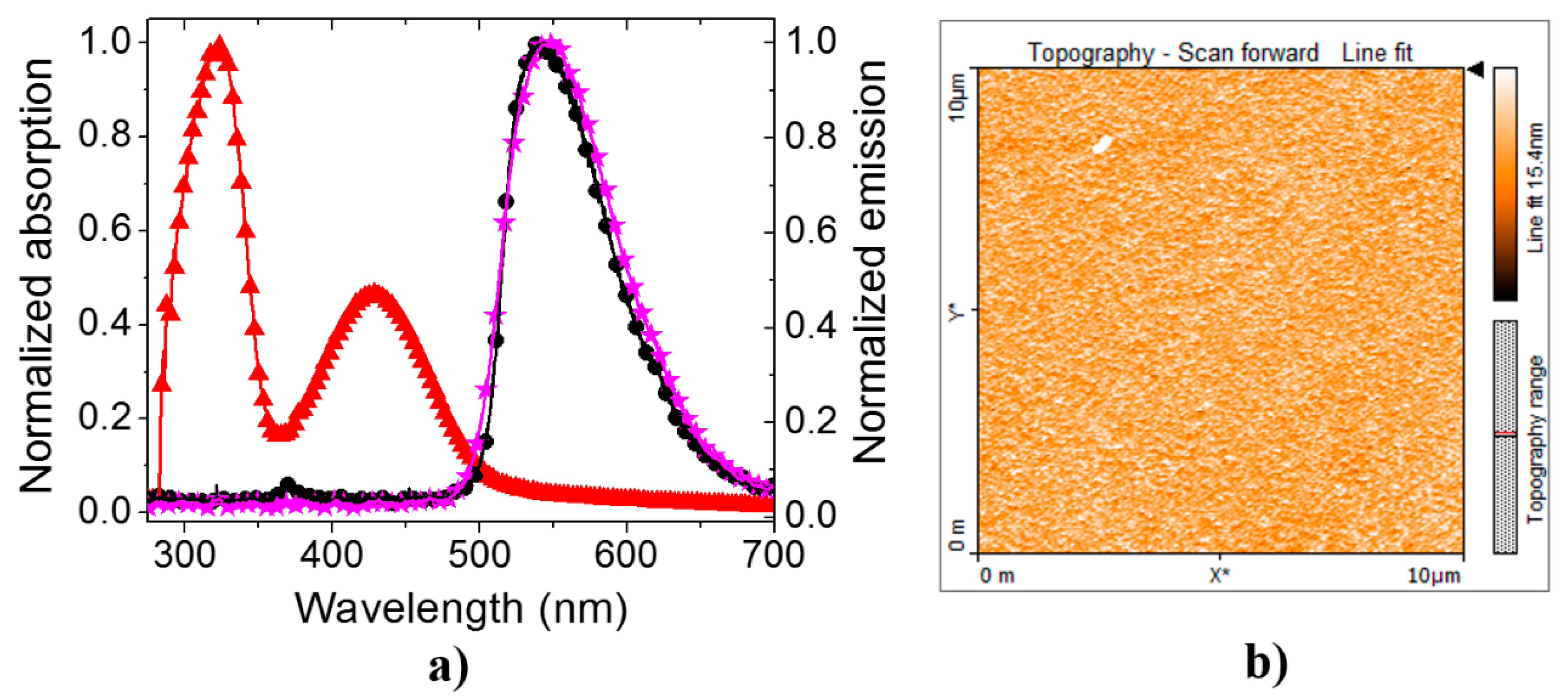(a) Normalized absorption (red triangles), fluorescence emission (black circles), both in solution of chlorobenzene, and electroluminescence emission (purple stars) in solid state of PF–1; (b) AFM image of a PF–1 thin film surface (Rα of the order of 1.4 nm).