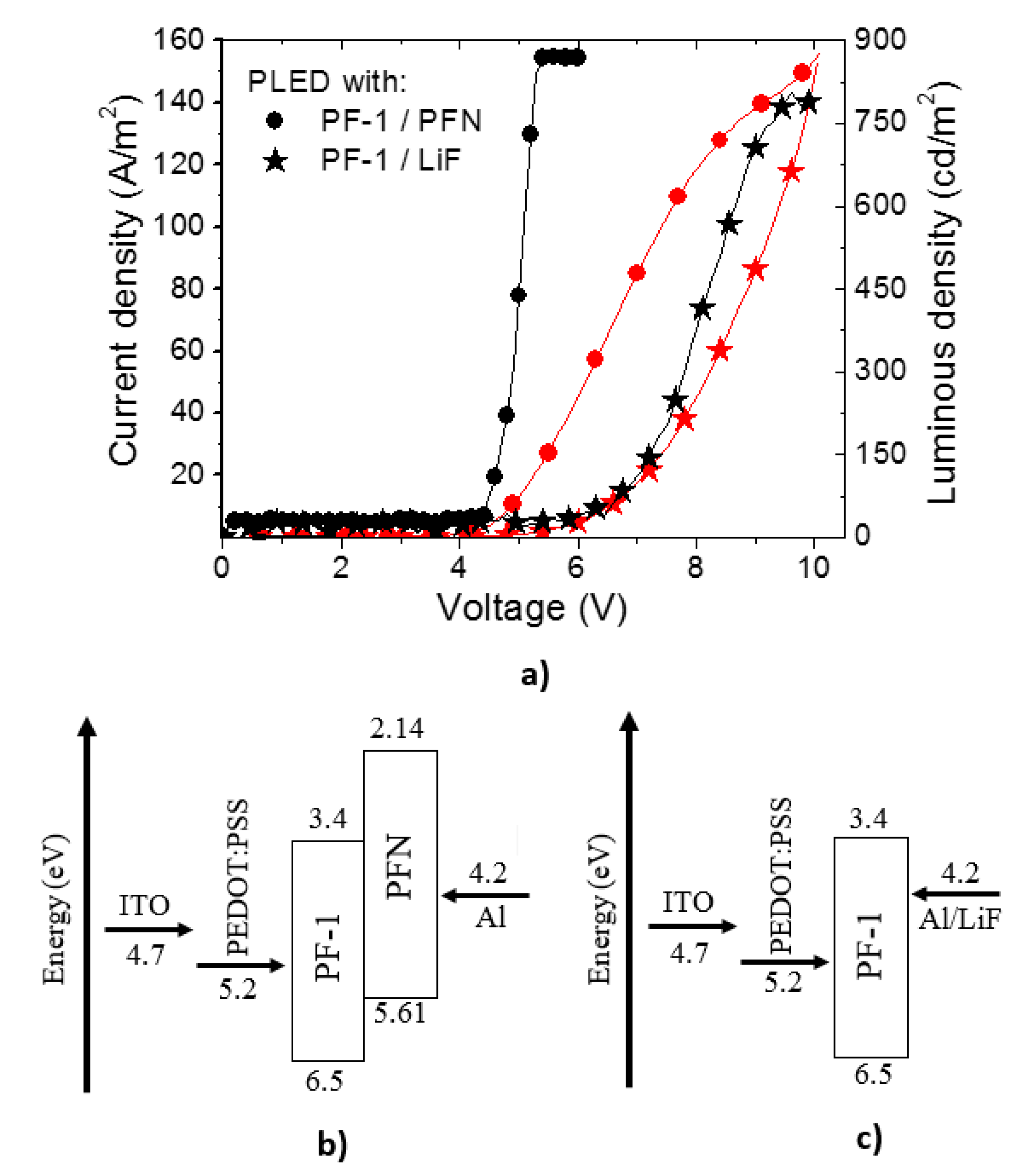 (a) Current density (red symbols) and luminous density (black symbols) as a function of applied voltage for PLEDs containing PFN (circles) and LiF (stars) as electron injectors, respectively. Schematic energy diagram for HOMO and LUMO levels for PLEDs with (b) PFN and (c) LiF.