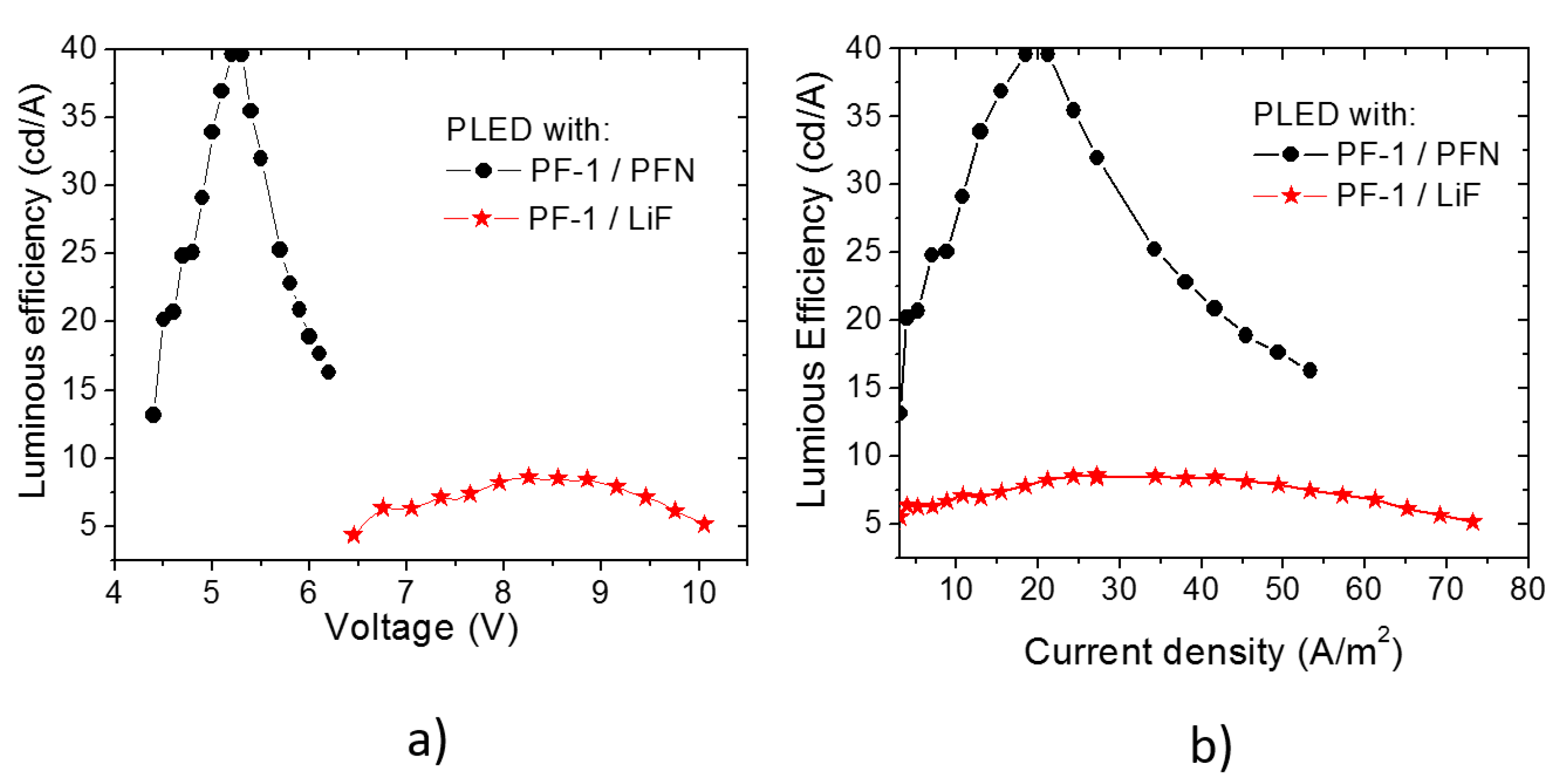 Luminous efficiency of PLEDs based on PF–1 polymer with the electron injectors PFN and LiF as a function of (a) applied voltage, and (b) current density.