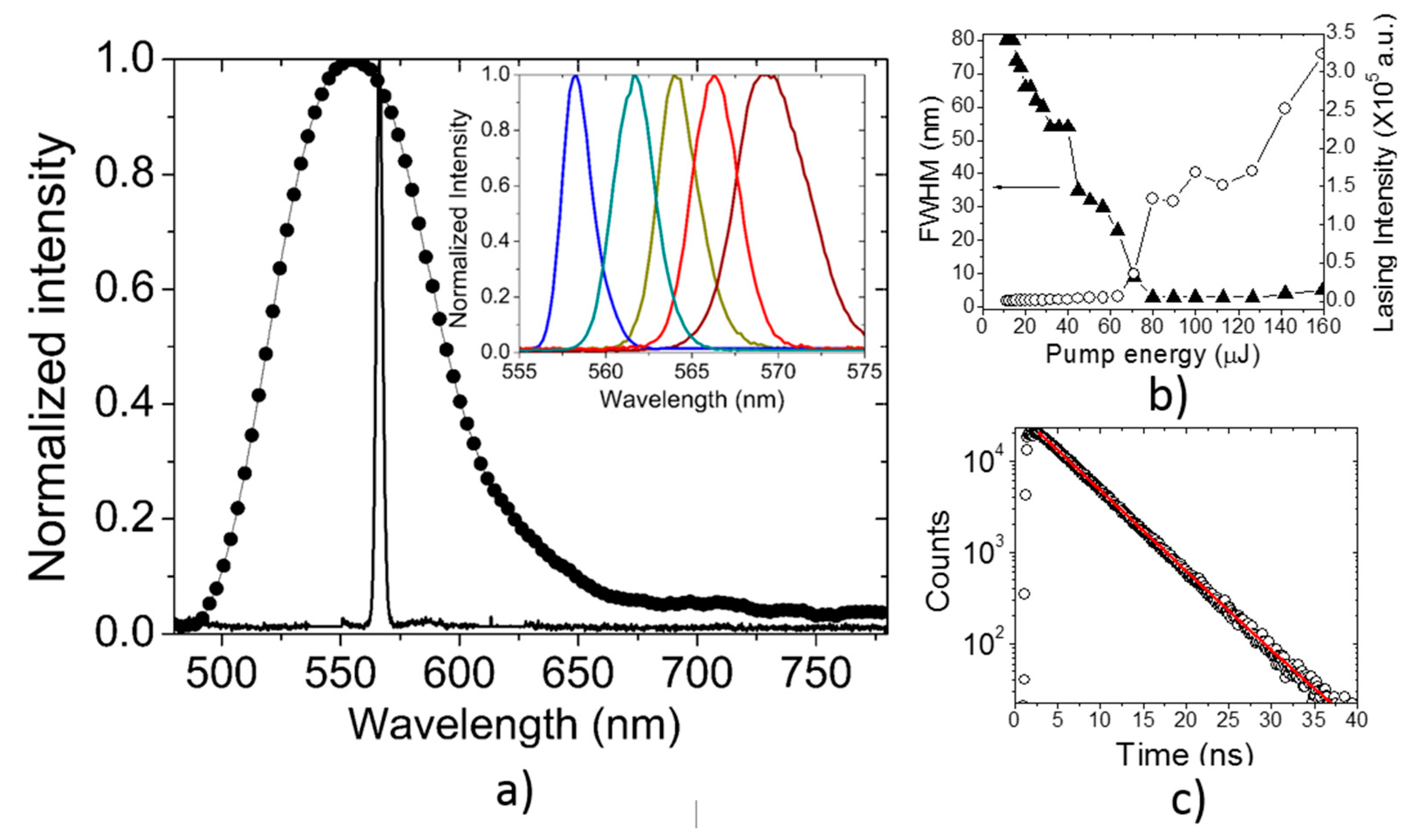 (a) Fluorescence (circles) and lasing (narrow line) of PF–1 in chlorobenzene solution. Inset, tunability of PF–1 lasing; (b) FWHM and lasing intensity of 566 nm emission for a solution of PF–1 as a function of the pump energy; (c) PF–1 fluorescence lifetime.
