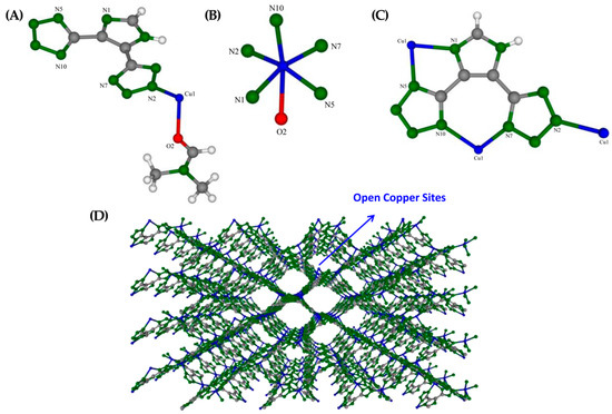 (A) Asymmetric unit of URJC-1 structure; (B) copper coordination; (C) ligand coordination; (D) and three-dimensional view of URJC-1 structure free of solvent. Cu: blue, C: grey, N: green, and O: red.