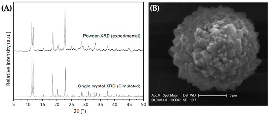 (A) XRD patterns of powder URJC-1 sample and simulated from single-crystal data; (B) SEM micrographs of the as-synthesized URJC-1 sample.