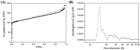 (A) Ar adsorption–desorption isotherms at 87 K; and (B) pore size distribution estimated by non-local DFT of the activated URJC-1 sample.