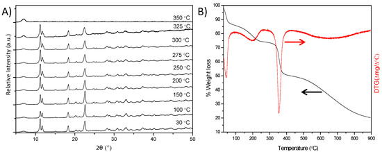 (A) In-situ temperature-dependence PXRD patterns and (B) TG/DTG analyses of URJC-1 material.