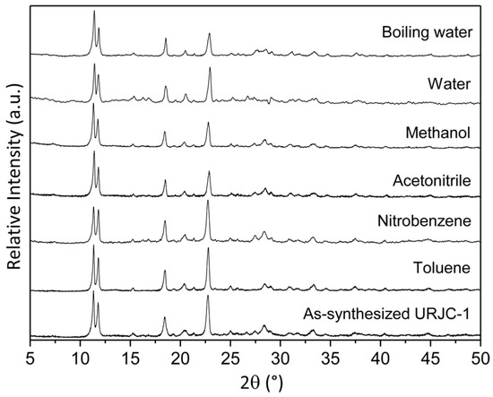 The chemical stability of URJC-1 material was tested by dispersion of the solid sample in different organic solvents. The solvents were selected according to their different polarity (polarity index of toluene is 2.3 and that of water 10.2). Figure 6 shows the PXRD patterns of URJC-1 material after dispersion in each solvent during 24 h at room temperature. As it is observed, the crystalline structure remained intact after the chemical stability tests, evidencing a strong robustness of the copper–imidazole/tetrazole framework. Additionally, the URJC-1 material also maintained its integrity when it was immersed in boiling water for 1 h (also shown in Figure 6).