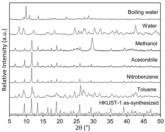 PXRD patterns of HKUST-1 material after suspension in different solvents.