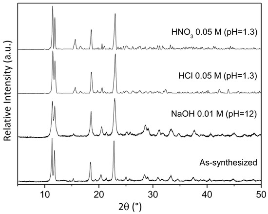 Finally, the stability of the URJC-1 material was also studied under strong acidic and basic conditions using HCl and HNO3 solutions (0.05M, pH = 1.3) and NaOH solution (0.01M, pH = 12). Figure 8 shows PXRD patterns of URJC-1 samples after 1 h at room temperature, evidencing that the crystalline URJC-1 framework was also stable under acid and basic agents. From these results, it has been attested that the URJC-1 material provides not only a crystalline microporous framework with promising acid and basic properties but also a remarkable thermal and chemical stability, which make it very attractive for catalytic applications.